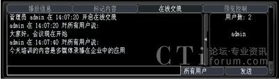 系統(tǒng)增加了多方文字互動交流功能,在線交流功能可以選擇給所有人員發(fā)送消息,也可以選擇給某一特定人員發(fā)送。這樣在會議或培訓(xùn)的過程中,管理員可以選擇性的提出相應(yīng)的問題給相關(guān)人員,考核相關(guān)人員的培訓(xùn)效果;其他人員也可以將會議或培訓(xùn)過程中遇到的疑問、難點(diǎn)及時的反應(yīng)給管理員進(jìn)行解答,增強(qiáng)會議或培訓(xùn)的成效。