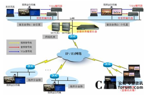 項目中采用了一套銳。ǚ植际剑┒嗝襟w錄播系統(tǒng),其中多媒體錄播服務(wù)器一臺,部署在網(wǎng)絡(luò)機(jī)房;兩套編碼器分別部署在會議室和小禮堂,編碼器從視頻會議終端獲取視音頻及雙流信號,并通過IP網(wǎng)絡(luò)發(fā)送給機(jī)房內(nèi)多媒體錄播服務(wù)器,由多媒體錄播服務(wù)器實現(xiàn)視頻會議的錄制、直播和點播,該服務(wù)器支持2組會議并發(fā)錄播,可滿足2組并發(fā)視頻會議的錄播需要。分會場及不具備視頻會議終端的地方,可使用電腦登陸多媒體錄播服務(wù)器來接收會議的實時直播或在會后進(jìn)行點播。