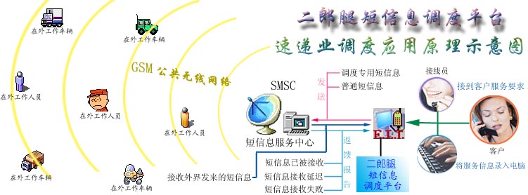 二郎腿短信息調(diào)度平臺是利用目前社會上大眾普遍擁有手機的現(xiàn)成資源,通過移動通訊公司提供的短信息服務(wù)功能作為通信信道,直接對手機進行低層操作控制,以“收發(fā)短信息”的方式來實現(xiàn)信息的傳遞(通信資費標準與在手機上收發(fā)短信相同)。調(diào)度平臺還對每條發(fā)出的信息的接收狀態(tài)進行跟蹤,確保信息能被安全