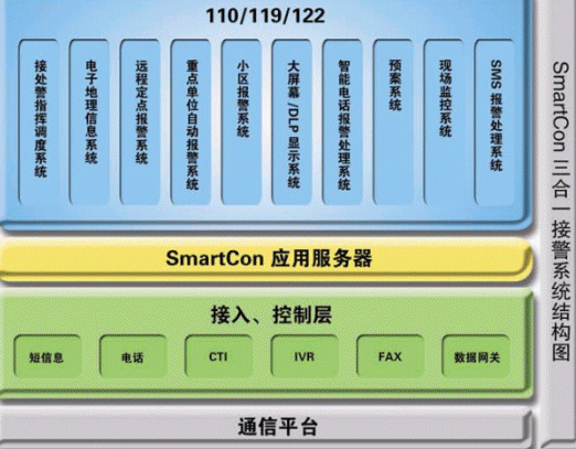 110/119/122等系統(tǒng)和一般企業(yè)的客服系統(tǒng)和熱線(xiàn)系統(tǒng)有一定的共性,但它們肩負(fù)著保障社會(huì)安定和人民生命財(cái)產(chǎn)安全的重任,這些決定了該系統(tǒng)的特殊性,使它有別于其他行業(yè)的應(yīng)用。我們公司依托雄厚的技術(shù)開(kāi)發(fā)力量,結(jié)合多年來(lái)在公安/消防/交通領(lǐng)域豐富的系統(tǒng)研發(fā)實(shí)施經(jīng)驗(yàn)積累,面向未來(lái)的發(fā)展,提出了以SmartCon呼叫中心平臺(tái)為核心的三體合一的、綜合的整體解決方案。該解決方案充分考慮到公安/消防/交通系統(tǒng)的現(xiàn)在和未來(lái)的發(fā)展趨勢(shì),110/119/122三個(gè)系統(tǒng)既可分開(kāi)單獨(dú)處理報(bào)警事務(wù),也可整體考慮、整體調(diào)度。該解決方案涵蓋了電話(huà)報(bào)警、SMS報(bào)警、接處警指揮調(diào)度、電子地理信息系統(tǒng)(GIS)、現(xiàn)場(chǎng)監(jiān)視以及小區(qū)報(bào)警雄等等,各個(gè)子系統(tǒng)之間相對(duì)獨(dú)立,用戶(hù)可以根據(jù)實(shí)際要求,進(jìn)行自由搭配,充分體現(xiàn)了系統(tǒng)的靈活性。