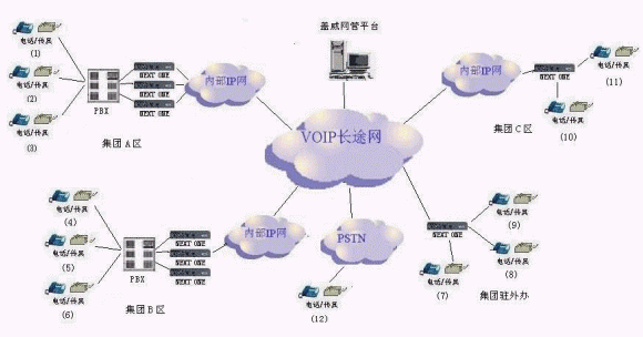深圳市蓋威科技有限公司完整的語音解決方案如下,用一個(gè)網(wǎng)管平臺(tái)(AVS SERVER)來管理眾多企業(yè),各企業(yè)分支機(jī)構(gòu)間可以實(shí)現(xiàn)相互通話免話費(fèi),另外將企業(yè)內(nèi)部通話之外的電話通過網(wǎng)管平臺(tái)接入到電信營(yíng)運(yùn)商的VoIP