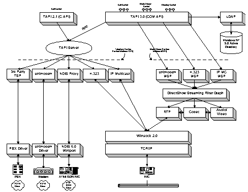 最新的TAPI 3.0基于微軟的COM標準,它允許TAPI應用程序采用包括JAVA?、Visual Basic?、Visual C++?在內(nèi)的各種語言進行編寫,同時還可以方便的通過ActiveX技術(shù)將其移植到互聯(lián)網(wǎng)中去。TAPI除了支持傳統(tǒng)的電話應用,還支持標準的H.323會議和IP多點會議,良好的QoS支持使得它增強了會議的質(zhì)量和網(wǎng)絡(luò)的可管理性。TAPI采用了統(tǒng)一的媒體流接口-DirectShowTM,TAPI媒體流提供商(MSP)只要針對不同的電話提供商(TSP)來實現(xiàn)DirectShowTM接口就可以被應用程序使用。