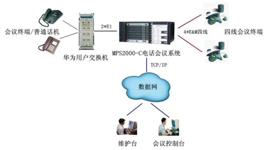 在接入上,通過(guò)2個(gè)數(shù)字中繼與華為大型用戶交換機(jī)互連,實(shí)現(xiàn)華為用戶交換機(jī)下的模擬用戶作為與會(huì)用戶的接入,也可通過(guò)華為交換機(jī)出局,實(shí)現(xiàn)PSTN網(wǎng)內(nèi)的用戶接入。