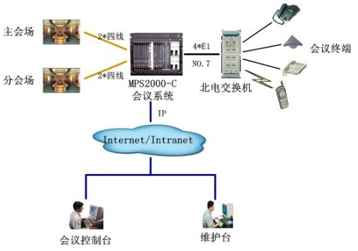 該會(huì)議系統(tǒng)通過(guò)4個(gè)數(shù)字中繼,與北電用戶(hù)交換機(jī)互連,采用七號(hào)信令。與視頻會(huì)議系統(tǒng)主會(huì)場(chǎng)采用四線(xiàn)音頻接口接主會(huì)場(chǎng)調(diào)音臺(tái),保證與視頻會(huì)議系統(tǒng)音頻的無(wú)縫對(duì)接。通過(guò)以太網(wǎng)口與局域網(wǎng)連接,實(shí)現(xiàn)維護(hù)管理及會(huì)議控制等功能。