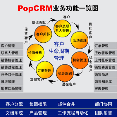 PopCRM吸收了國內(nèi)外先進(jìn)的管理思想,以客戶的需求為根本,以應(yīng)用價值為核心,聚焦銷售環(huán)節(jié),對客戶資源統(tǒng)一管理,規(guī)范銷售行為;對銷售進(jìn)行分析預(yù)測,提供決策依據(jù);對客戶進(jìn)行全面分析,提供客戶關(guān)懷,吸引并留住客戶,全面提高企業(yè)的盈利能力。
