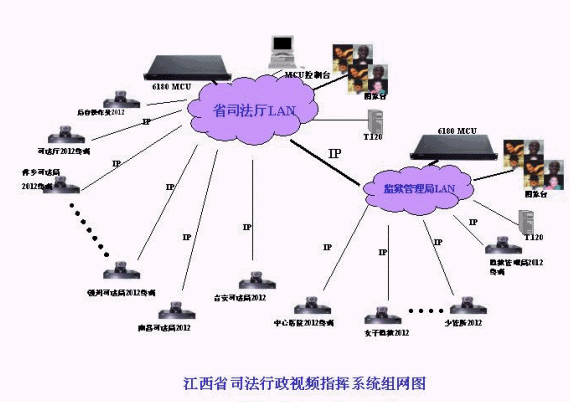 江西司法視頻會議系統(tǒng)的拓撲結(jié)構(gòu)如圖所示。整個視頻會議系統(tǒng)為星型拓撲結(jié)構(gòu),其中二級網(wǎng)以省司法廳和省監(jiān)獄管理局為主會場,放置2個MCU;另外,包括11個地市司法局的分會場(南昌、九江、贛州、吉安、撫州、鷹潭、萍鄉(xiāng)、新余、上饒、景德鎮(zhèn)、宜春),14個監(jiān)獄和農(nóng)場分會場,傳輸網(wǎng)絡為2M IP網(wǎng)絡,視頻會議協(xié)議為H.323;司法局和監(jiān)獄管理局也可以單獨成網(wǎng),在分別依托省司法廳和省監(jiān)獄管理局MCU的情況下,各地市司法局或監(jiān)獄系統(tǒng)可與省司法廳或省監(jiān)獄管理局單獨進行雙向的視頻會議,整個系統(tǒng)具有很強的靈活性和擴展性。