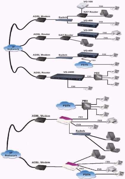 總部采用可堆疊的VG-2000,通過IP網(wǎng)絡(互聯(lián)網(wǎng))同各中心或分支機構的相連,利用PBX(小型電話交換總機)的交換能力將話音自動轉到VG-2000上,通過數(shù)據(jù)專線、VPN或Internet傳輸?梢栽赩G-2000上進行流量控制(Bandwidth
