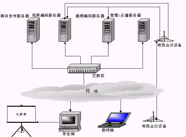 當老師端在異地時(攝像頭離服務器較遠,無法物理連接),可通過"電視會議系統(tǒng)"將老師的圖像及聲音實時傳送到編碼服務器,桌面課件可以通過PcAnywhere傳送到編碼服務器。圖像,聲音和桌面課件通過Web Streaming采集壓縮并在網(wǎng)上實時廣播。這種系統(tǒng)架構(gòu)也是當今功能比較齊全和完善的一種實現(xiàn)方式。