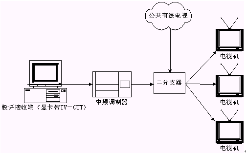 本系統(tǒng)接收端接收實時廣播時,除了用普通PC機收看,或把PC機接收到的信號輸?shù)诫娨暎ù笃粒┥鲜湛矗踔吝可以接入有線電視網(wǎng)進行播放。具體方法是通過一個接收端接收股評節(jié)目,通過帶TV-OUT的顯卡把TV信號輸出到中頻調(diào)制設備,中頻調(diào)制設備可以把基帶模擬信號轉(zhuǎn)換成一個有線電視信號,且傳輸距離遠,損失小,再把這個信號與有線電視信號一起接入一個二分支器(2進1出),這就可以和公共有線電視共存,形成自己的頻道,供電視接收。