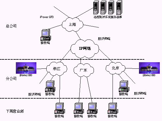 某證券公司有三級網(wǎng)絡,總公司、分公司和下屬營業(yè)部?偣镜椒止編捠2M,在總公司配置一套會議室型電視會議終端POLYCOM 970和一套多點會議服務器Radvision ViaIP400。在分公司配置了38套會議室型電視會議終端POLYCOM 680,用于與總公司進行雙向視頻會議。分公司到營業(yè)部帶寬是512K,各營業(yè)部安裝遠程股評系統(tǒng)接收端程序,遠程股評系統(tǒng)服務器都放置在海通總公司。當在總公司進行股評時,總公司本地攝像頭拍攝教師畫面,MIC采集教師聲音,傳給服務器編碼,再通過網(wǎng)絡供各個接收端接收;當在分公司進行股評時,首先分公司的電視會議設備采集教師畫面及聲音傳回總公司的電視會議設備,再傳給遠程股評系統(tǒng)的服務器進行編碼,然后通過網(wǎng)絡發(fā)布,供接收端接收。(結(jié)構(gòu)如下圖)