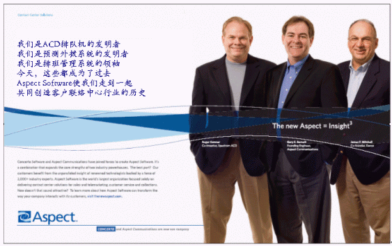 非常感謝您對(duì)科勝通軟件(Aspect Software)中國(guó)公司的支持,經(jīng)過一系列的收購與合并,全球呼叫中心呼入技術(shù)的發(fā)明者,全球呼叫中心呼出技術(shù)的發(fā)明者,全球一體化聯(lián)絡(luò)中心系統(tǒng)的締造者,全球勞動(dòng)力管理排班系統(tǒng)的領(lǐng)導(dǎo)者,在世界高新技術(shù)飛速發(fā)展的今天,歷史性的走到了一起,誕生了全新的世界級(jí)呼叫中心的巨輪Aspect