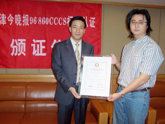 2004年9月9日,天津今晚報公眾服務中心通過了《全國呼叫中心運營績效標準》(CCCS-OP-2003)認證,并獲得由中國信息化推進聯(lián)盟客戶關系管理專業(yè)委員會頒發(fā)的認證證書(四星級客戶服務中心),成為國內傳媒業(yè)首家通過此認證的呼叫中心。