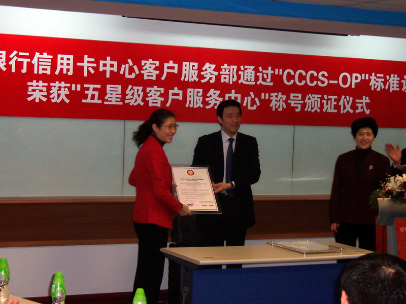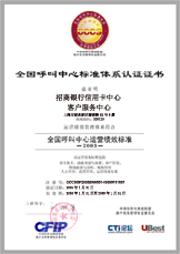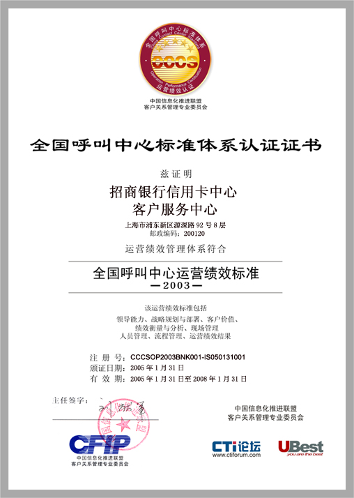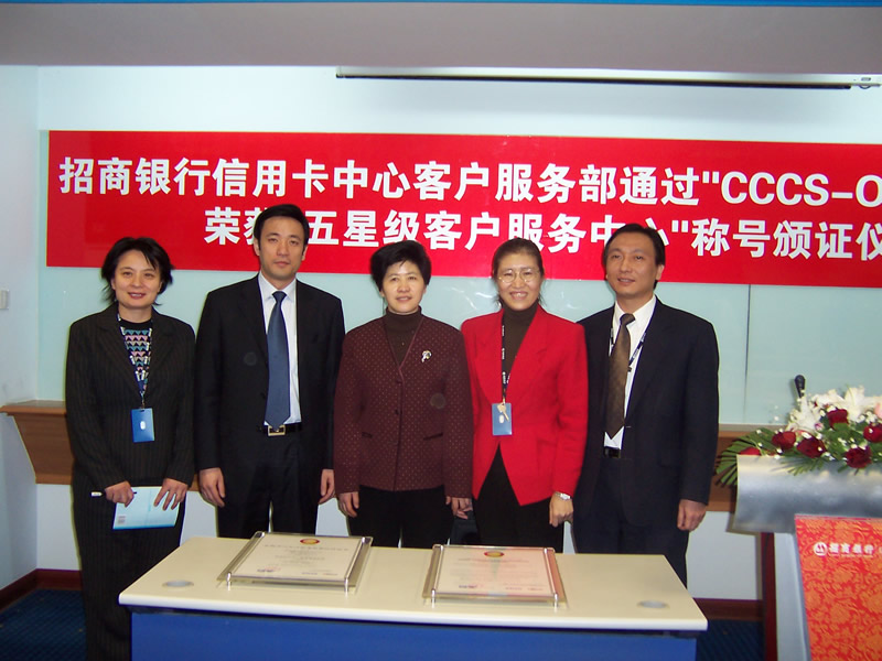 經(jīng)過長達8個月時間的準備和嚴格的認證審核,由中國信息化推進聯(lián)盟客戶關系管理專業(yè)委員會常務副主任郭晨東先生親自掛帥組成的項目評審專家小組從領導能力、戰(zhàn)略規(guī)劃與部署、客戶價值、績效衡量與分析、現(xiàn)場管理、人員管理、流程管理、運營績效結(jié)果等八個范疇對招商銀行信用卡中心客戶服務部進行了全面而嚴格的審核,涉及五大類上百項詳細的運營績效指標,歷經(jīng)初審評估、現(xiàn)場初審、初審評估報告提交與確認、標準試運行、績效全面提升、最終評審等階段,最終審核確認招商銀行信用卡中心客戶服務完全符合并部分超越《全國呼叫中心運營績效標準》(CCCS-OP-2003)的各項標準指標和要求,于2005年1月31日正式批準招商銀行信用卡中心通過該標準的五星級認證,授予“五星級客戶服務中心”稱號。