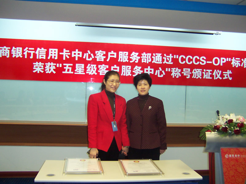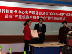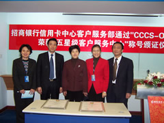 這天的上午10點30分,在招商銀行信用卡中心上?偛颗e行了簡約而隆重的頒證儀式,信用卡中心常務副總經(jīng)理梁瑤蘭從信息產(chǎn)業(yè)部電子信息中心副主任、中國信息化推進聯(lián)盟秘書長劉獻軍手中接過證書,標志著國內(nèi)第一家五星級客戶服務中心誕生了!