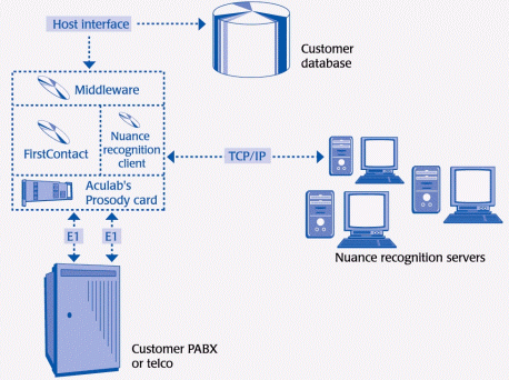 Prosody板卡位于系統(tǒng)的底層,已集成在VeCab系統(tǒng)中。FristContact 媒體服務(wù)器與Prosody硬件的通信是通過Aculab的統(tǒng)一API實(shí)現(xiàn)的。Prosody不僅用于TTS,而且也用于其它語音處理功能,例如放音、錄音、回音消除和DTMF檢測(cè)和生成。此外,VeCab 使用 Aculab的高密度數(shù)字網(wǎng)絡(luò)接口模塊來連接ACT的電話系統(tǒng)。