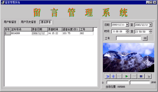 當(dāng)系統(tǒng)中無(wú)話(huà)務(wù)員登錄或等待超過(guò)20秒,則進(jìn)入語(yǔ)音信箱服務(wù)。語(yǔ)音信箱在進(jìn)入時(shí)提示用戶(hù):“系統(tǒng)正忙,請(qǐng)留下您的聯(lián)系電話(huà),復(fù)本機(jī)號(hào)請(qǐng)掛機(jī),復(fù)其他號(hào)碼請(qǐng)輸入電話(huà)號(hào)碼,按‘#’號(hào)鍵結(jié)束,或者在聽(tīng)到‘嘟’的一聲之后留下你的留言”,當(dāng)主叫號(hào)碼位數(shù)不夠7位時(shí),提示:“系統(tǒng)正忙,請(qǐng)輸入您的聯(lián)系電話(huà),按‘#’號(hào)鍵結(jié)束,或者在聽(tīng)到‘嘟’的一聲之后留下你的留言”,系統(tǒng)將客戶(hù)留下的電話(huà)號(hào)碼記錄到數(shù)據(jù)庫(kù)中。將留言存放到一個(gè)指定目錄中,用話(huà)務(wù)號(hào)作為語(yǔ)音文件名。