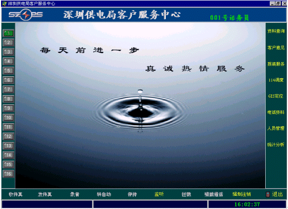 在座席的主畫(huà)面的右邊是業(yè)務(wù)功能選擇區(qū),是根據(jù)用戶(hù)實(shí)際工作的具體要求開(kāi)發(fā)的。(隨后詳細(xì)介紹供電行業(yè)的業(yè)務(wù)功能模塊)