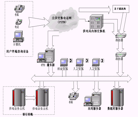 (3)自動(dòng)轉(zhuǎn)人工服務(wù)。系統(tǒng)還可自動(dòng)轉(zhuǎn)接人工坐席,由電力專業(yè)人員負(fù)責(zé)解答和處理客戶意見。或者將客戶服務(wù)中心系統(tǒng)與后臺(tái)數(shù)據(jù)庫服務(wù)器相接,通過客戶提供的相關(guān)信息,為客戶提供個(gè)性化的在線服務(wù)。