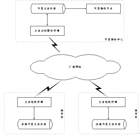 單一的節(jié)目制作中心一般放置在省中心。在節(jié)目制作中心,節(jié)目數(shù)據(jù)以數(shù)據(jù)庫(kù)或者文本文件的方式存放于節(jié)目數(shù)據(jù)倉(cāng)庫(kù)中。在節(jié)目制作中心運(yùn)行文本訪(fǎng)問(wèn)服務(wù)代理,接受各地市臺(tái)的數(shù)據(jù)請(qǐng)求并發(fā)送相應(yīng)的數(shù)據(jù)。各個(gè)地市臺(tái)通過(guò)文本請(qǐng)求、接收代理向中心請(qǐng)求或者接收文本數(shù)據(jù),存放于本地?cái)?shù)據(jù)倉(cāng)庫(kù),等待語(yǔ)音合成服務(wù)器合成成語(yǔ)音文件,地市臺(tái)使用合成后的語(yǔ)音文件迅速開(kāi)通相應(yīng)的節(jié)目。
