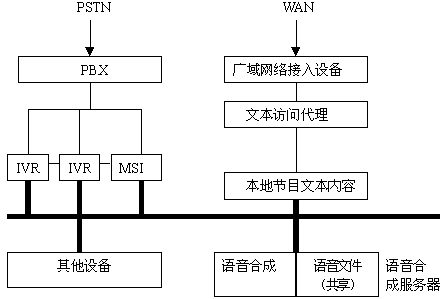 離線(xiàn)合成可以與省級(jí)甚至全國(guó)聲訊網(wǎng)絡(luò)結(jié)合,開(kāi)發(fā)出靈活的聯(lián)網(wǎng)業(yè)務(wù)。即文本訪(fǎng)問(wèn)代理從廣域網(wǎng)上取得節(jié)目文本數(shù)據(jù)存放于本地的文本數(shù)據(jù)共享目錄,語(yǔ)音合成服務(wù)器通過(guò)訪(fǎng)問(wèn)該目錄獲取節(jié)目文本合成為語(yǔ)音文件存放與服務(wù)器的語(yǔ)音文件共享目錄中。局域網(wǎng)內(nèi)其他設(shè)備(IVR、MSI等等)訪(fǎng)問(wèn)語(yǔ)音文件共享目錄,向用戶(hù)播放最新生成的語(yǔ)音信息。