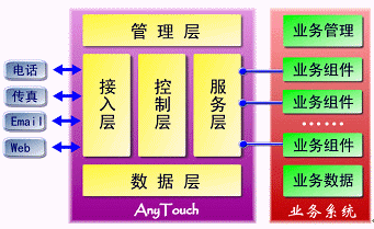 AnyTouch不僅僅是一個(gè)面向應(yīng)用開(kāi)發(fā)商、系統(tǒng)集成商的CTI中間件產(chǎn)品,而且提供支持最終用戶自我維護(hù)、開(kāi)發(fā)、編輯的業(yè)務(wù)接口與開(kāi)發(fā)工具包。基于AnyTouch,可以根據(jù)不同的行業(yè)需求開(kāi)發(fā)出不同的業(yè)務(wù)應(yīng)用系統(tǒng),從而構(gòu)筑屬于自己的呼叫中心、企業(yè)增值服務(wù)、通訊服務(wù)、信息服務(wù)及CRM系統(tǒng)。