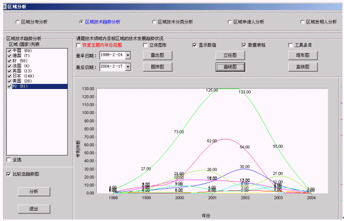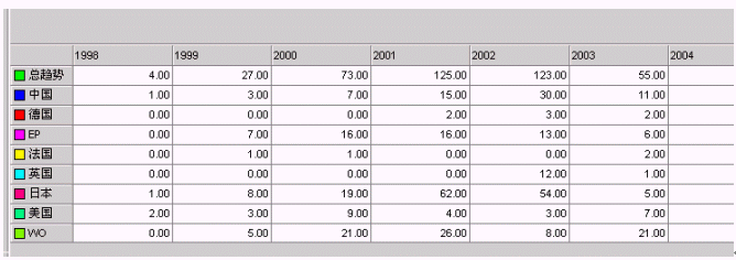 從圖1分析,98-2004年該領(lǐng)域技術(shù)發(fā)展大致分為3個周期,即98-2000年、2001-2003年、2003-2004年。目前正處于第三個周期后期。
