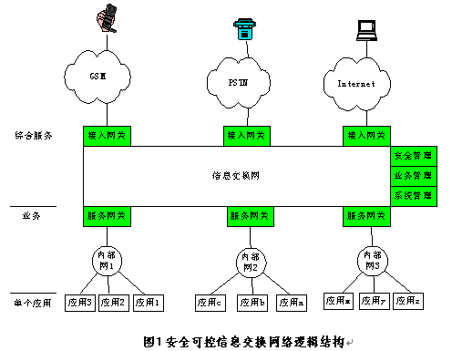 整個(gè)安全可控信息交換網(wǎng)系統(tǒng)由三個(gè)邏輯部分組成:網(wǎng)關(guān)、信息交換網(wǎng)、管理。接入網(wǎng)關(guān)連接各種公共服務(wù)網(wǎng),包括Internet網(wǎng)、GSM、PSTN、CATV等,它將不同公共服務(wù)網(wǎng)的通信協(xié)議轉(zhuǎn)換成統(tǒng)一的信息交換網(wǎng)的XML協(xié)議。