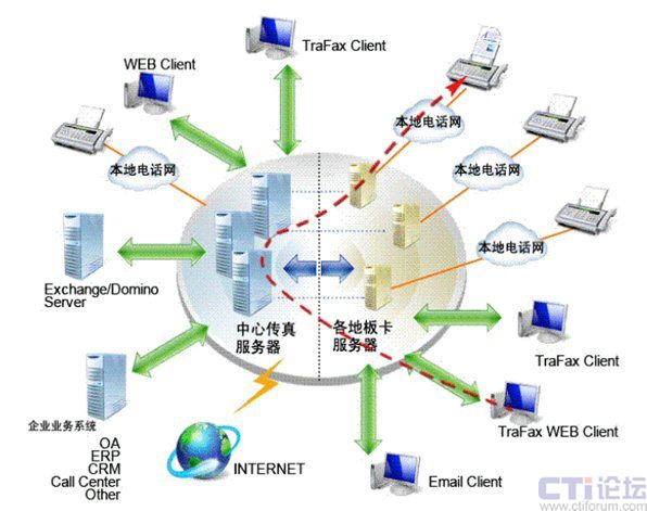Server板卡服務(wù)器都將通過Internet或企業(yè)網(wǎng)絡(luò)而相互連接起來,協(xié)同工作, 共同分擔(dān)工作負(fù)荷, 共享資源和傳真信道。這樣傳真也是被傳遞到離目的地最近的板卡服務(wù)器后才發(fā)送出去,從而將國際,國內(nèi)傳真費用減少為本地傳真費用。