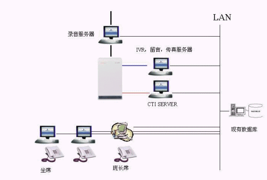 按照用友北京分公司行業(yè)特點(diǎn)、現(xiàn)狀和需求,呼叫中心系統(tǒng)采用愛立信MD110交換機(jī),加配CTI接口設(shè)備,配合我公司的CTILink和IVR服務(wù)器,實現(xiàn)呼叫中心的全部功能。該系統(tǒng)中繼線采用數(shù)字中繼線(30B+D),16路IVR系統(tǒng)和20個人工坐席,處理用戶申告業(yè)務(wù)。