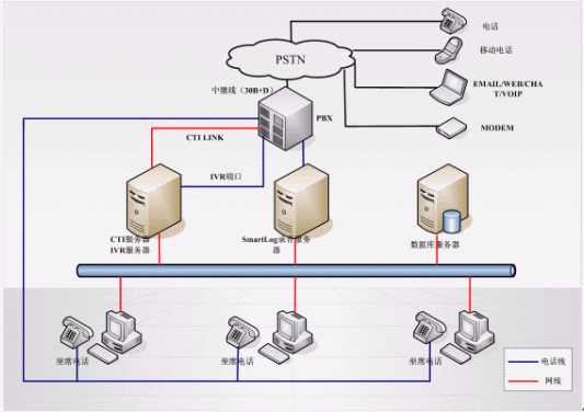 呼叫中心前端通信平臺(tái),主要由SIEMENS HiPath系列交換機(jī),計(jì)算機(jī)電話集成服務(wù)器(UltraCTI),交互式語(yǔ)音應(yīng)答服務(wù)器(ctsIVR),在線錄音監(jiān)聽(tīng)服務(wù)器(SmartLog),數(shù)據(jù)庫(kù)服務(wù)器,MCI服務(wù)器以及傳真服務(wù)器幾個(gè)部分組成。中繼線多采用30B+D或2B+D接入。