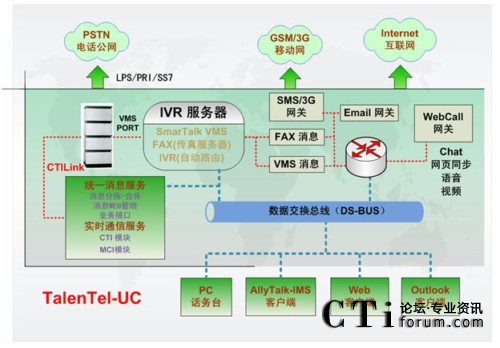 “TalenTel-UC企業(yè)級(jí)統(tǒng)一通信系統(tǒng)”采用CTI的核心技術(shù),把企業(yè)通信系統(tǒng)、計(jì)算機(jī)辦公系統(tǒng)、和業(yè)務(wù)流程有機(jī)結(jié)合起來(lái),充分利用企業(yè)現(xiàn)有設(shè)備資源,實(shí)現(xiàn)IT系統(tǒng)的易用性和通信系統(tǒng)的實(shí)用性,從而推動(dòng)企業(yè)信息化、無(wú)紙化辦公進(jìn)程,降低辦公成本,提高辦公效率,對(duì)行政辦公模式的變革產(chǎn)生深遠(yuǎn)的影響。