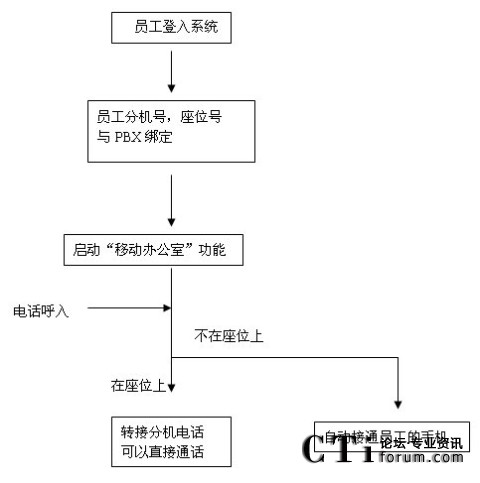 每個(gè)需要到企業(yè)辦公的員工,可以通過門禁系統(tǒng),或?qū)iT一臺PC上進(jìn)行登入,通過后由系統(tǒng)自動分配或員工選擇一個(gè)空閑的座位,座位號與員工的分機(jī)號碼綁定,所有對這個(gè)員工分機(jī)的呼叫均被自動轉(zhuǎn)移到其座位上的辦公電話上;