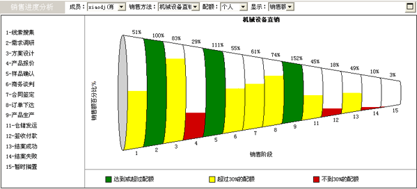 圓錐體上方每個階段都對應一個百分比數(shù)值,表示當前各個銷售階段的銷售額與該階段任務指標的比率。例如假設"線索搜集"階段的任務指標是100,000元,當前的比率是51%,則表示當前處于"線索收集"階段的機會的銷售額之和是51,000元。如果銷售額/任務指標的值小于30%,則以紅色塊表示;如果值介于30%~100%則以黃色塊表示,如果值大于或等于100%,則以綠色塊表示。