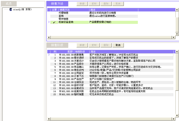 一套好的CRM軟件,應當同時支持多種銷售方法。例如,精密機械制造行業(yè),有可能同時需要支持四種銷售方法:標準整機銷售方法、項目型整機銷售方法、零件及有償服務銷售方法、三包件等。每個銷售方法都有對應的銷售流程。以圖2為例,我們看到"機械設備直銷"的銷售方法,對應著15個銷售階段,每個階段都可通過簡述來明確該階段典型的業(yè)務特征、成交可能性的區(qū)間,以便銷售代表在操作記錄的時候擁有共識。