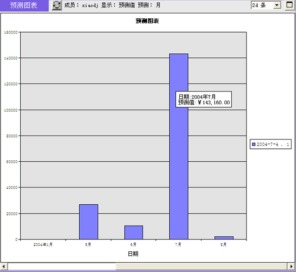 * 100% = 504,402.50元的一個預測值,在相同時間段的機會預測值將被累計求和。很顯然,可以在不同時間點(例如6月1日、7月1日、8月1日、9月1日)多次對2004年9月的銷售額進行預測。得到一系列的銷售預測值變動趨勢。