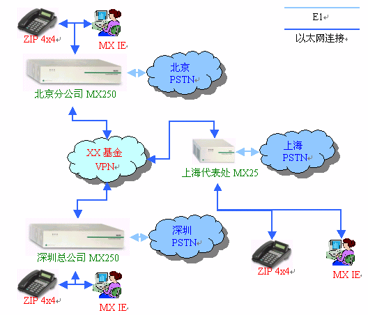 利用現(xiàn)有的VPN網(wǎng)絡(luò)連接深圳總公司和北京分公司的兩臺MX250媒體交換機(jī),上海辦事處配備一臺MX25網(wǎng)關(guān),MX250、MX25與當(dāng)?shù)氐碾娫捑W(wǎng)連接。深圳總公司、北京分公司和上海辦事處配備一定數(shù)量的SIP話機(jī),員工電腦安裝MXIE軟件。