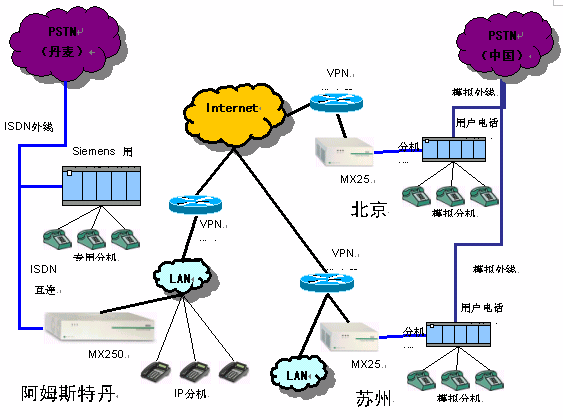 在阿姆斯特丹配置一臺(tái)MX250交換機(jī),通過ISND連接原有交換機(jī)及丹麥PSTN網(wǎng)絡(luò),北京安裝一臺(tái)MX25網(wǎng)關(guān)與原有集團(tuán)電話互聯(lián),蘇州安裝一臺(tái)MX25與原有呼叫中心互聯(lián),三點(diǎn)通過基于Internet的VPN組成專用VOIP網(wǎng)。
