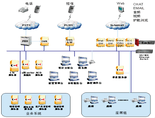 。。系統(tǒng)采用PBX提供完備的呼叫控制功能,能夠滿足呼叫中心電話應(yīng)用的需要,實(shí)現(xiàn)呼入、呼出、內(nèi)部通話、保持、接回、咨詢、轉(zhuǎn)接、會(huì)議等各種電話控制功能;同時(shí),PBX具有CTILink接口,可實(shí)現(xiàn)與計(jì)算機(jī)系統(tǒng)的連接。