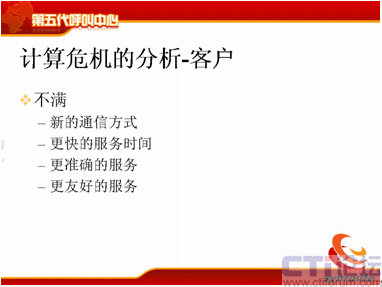 我分析一下計(jì)算的危機(jī),計(jì)算危機(jī)來(lái)源于三個(gè)方面,第一是客戶面對(duì)不斷提升的服務(wù)水平,現(xiàn)在需要新的通信方式,包括電話、傳真、短信、電子郵件等等,還包括網(wǎng)上的護(hù)航瀏覽,表單共享,電子排版等等通信方式。第二方面需要更快的服務(wù)時(shí)間,80%的電話是20秒接起,可是短信的響應(yīng)時(shí)間為什么這么長(zhǎng),需要更準(zhǔn)確的服務(wù),電話的服務(wù)是什么樣的,我現(xiàn)在需要網(wǎng)上交談的服務(wù)質(zhì)量也能夠得到保障等等,這是客戶對(duì)IT服務(wù)者提供的壓力。
