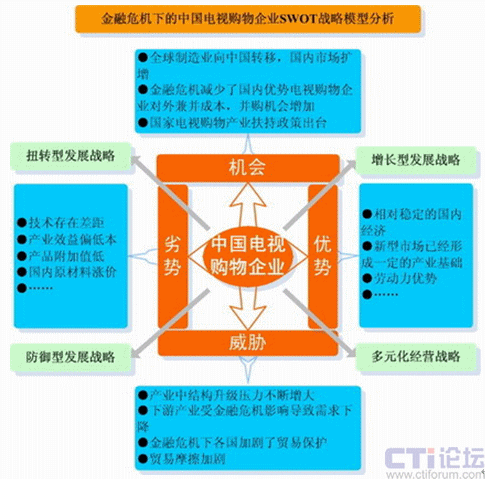 1992年至2009年以來(lái),電視購(gòu)物經(jīng)歷了從割據(jù)到統(tǒng)一,全國(guó)購(gòu)物頻道網(wǎng)絡(luò)化;從粗放到科學(xué),頻道運(yùn)營(yíng)模式專(zhuān)業(yè)化;從簡(jiǎn)介到深度,頻道編排方式規(guī)律化、從滯后到及時(shí),物流配送體系成熟化。電視購(gòu)物被譽(yù)為繼零售、超市之后的第三次銷(xiāo)售革命,電視購(gòu)物將成為金融危機(jī)經(jīng)濟(jì)形態(tài)下未來(lái)中國(guó)電視新的經(jīng)濟(jì)增長(zhǎng)點(diǎn),而付費(fèi)電視、數(shù)字網(wǎng)絡(luò)電視的發(fā)展,是中國(guó)電視購(gòu)物市場(chǎng)新的戰(zhàn)略機(jī)會(huì)。金融危機(jī)下的中國(guó)電視購(gòu)物企業(yè)SWOT戰(zhàn)略模型分析如下: