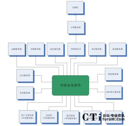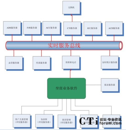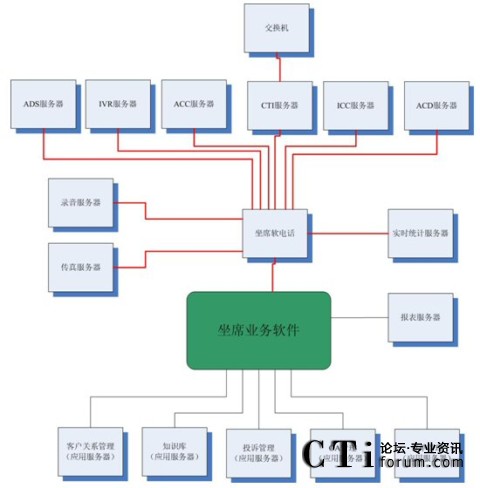很多集成商或業(yè)務(wù)軟件開發(fā)商認(rèn)為這種結(jié)構(gòu)過于復(fù)雜,而他們自身往往提供“整體解決方案”,即所有的服務(wù)器軟件基本上都是自己的,根據(jù)客戶的要求修改即可。例如,客戶關(guān)系管理、知識庫、投訴管理、OA、訂單管理以及坐席軟電話、ADS服務(wù)器、IVR服務(wù)器、ACC服務(wù)器、ICC服務(wù)器、ACD服務(wù)器、錄音服務(wù)器、傳真服務(wù)器、報(bào)表服務(wù)器、實(shí)時統(tǒng)計(jì)服務(wù)器都是自己來做,那么對于很多接口環(huán)節(jié)都可以節(jié)省了。