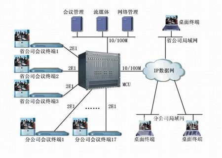 該系統(tǒng)中MCU配置了可以實現(xiàn)不少于120個會場同時開會的能力,而且能夠同時支持128組會議,因此借助于交互式桌面終端可以實現(xiàn)靈活的PC多媒體應用業(yè)務。整個系統(tǒng)可以在省電力公司的局域網(wǎng)上實現(xiàn)任何PC參與或旁聽的桌面多點會議。