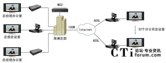 2009年6月,領先的視訊廠商科達攜TrueSens(致勝)視頻會議系統(tǒng)走進海瀾,為海瀾集團搭建了一套覆蓋總部2個領導辦公室、1個銷售會議室及全國32個分公司的視頻會議系統(tǒng)。整個方案在部署上非常便捷,海瀾江陰總部的機房架設一臺高、標清一體化多點控制單元(MCU),銷售會議室、集團王總、陶總的辦公室以及海瀾集團在全國的32個分公司銷售會議室則各部署一套視頻會議終端?偛繋挒100M,分支機構(gòu)則均通過普通ADSL接入。系統(tǒng)拓撲圖如下: