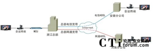 該套視頻會(huì)議系統(tǒng)最大的特點(diǎn)就是擁有超強(qiáng)的網(wǎng)絡(luò)適應(yīng)性。由于采用了高效視音頻編碼技術(shù)和大量智能化網(wǎng)絡(luò)適應(yīng)技術(shù),無(wú)論是ADSL、光纖還是VPN,均可進(jìn)行快速接入,并充分保證在Internet環(huán)境下的會(huì)議效果。因此,天元置業(yè)此次視頻會(huì)議系統(tǒng)就是完全基于公司現(xiàn)有的Internet進(jìn)行部署的。如圖1。