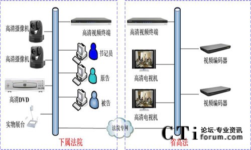 系統(tǒng)覆蓋省高院法庭、8個(gè)地市中院法庭和58個(gè)基層法庭。系統(tǒng)利用法院專用IP傳輸網(wǎng)絡(luò),以省高院各法庭為一級中心,地市中院為分控中心,基層法院為末端接入。在省高院中心、地市中院和基層分院設(shè)立遠(yuǎn)程數(shù)字庭審中心,配置庭審視頻終端、專用攝像機(jī)和麥克風(fēng),實(shí)現(xiàn)圖像傳輸和遠(yuǎn)程通信。