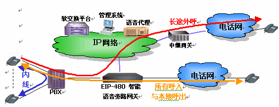EIP-480設(shè)備處于企業(yè)PBX(電話交換機(jī))和PSTN(固定電話網(wǎng))之間。它具有呼叫智能選路功能,支持通過判斷被叫號碼,自動將異地企業(yè)間或外部長途電話旁路到IP網(wǎng)絡(luò)上。