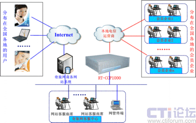 融天科技采用自主研發(fā)的融合通信平臺(tái)RT-CCP1000設(shè)備一套為奇旅網(wǎng)部署了一套Web-call聯(lián)絡(luò)中心。RT-CCP1000集傳統(tǒng)PBX、IP-PBX、CTI、IVR、DB、VOIP、錄音、傳真等服務(wù)于一體,以模塊化的形式提供用戶所需的各種功能,是一套功能強(qiáng)大的一體化融合通信平臺(tái),安裝部署非常方便,維護(hù)管理非常簡(jiǎn)單。該方案中,與本地電信運(yùn)營(yíng)商采用數(shù)字中繼E1接口和模擬中繼FXO接口方式連接,軟電話以控件方式嵌入到奇旅網(wǎng)公司的商務(wù)網(wǎng)站上, RT-CCP1000將接收所有以該控件方式來至Internet來的呼叫,并通過與電信運(yùn)營(yíng)商接口呼叫相關(guān)會(huì)員企業(yè)綁定的聯(lián)絡(luò)電話,這樣就實(shí)現(xiàn)了上網(wǎng)用戶通過電腦與會(huì)員企業(yè)免費(fèi)進(jìn)行直接聯(lián)絡(luò)。網(wǎng)絡(luò)拓?fù)鋱D如下: