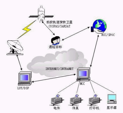 當(dāng)用戶(船舶、飛機(jī)或個人)遇險(xiǎn)后,遇險(xiǎn)示位信標(biāo)可以通過人工或者自動由遇險(xiǎn)時的撞擊、水浸而激活(信標(biāo)激活后可以存活48/小時),發(fā)出121.5MHz/243MHz/4O6MHz的遇險(xiǎn)報(bào)警信號,搜救衛(wèi)星則對遇險(xiǎn)示位信標(biāo)發(fā)出的遇險(xiǎn)報(bào)警信號進(jìn)行變頻、存儲、轉(zhuǎn)發(fā)等處理并轉(zhuǎn)發(fā),由幾個數(shù)據(jù)信號處理器(DSP)對衛(wèi)星的下行信號中的121.5MHz、243MHz、406MHz信號進(jìn)行實(shí)時處理或?qū)?06MHz信號進(jìn)行延時處理。由遍布全球的地面處理分系統(tǒng)本地用戶終端(LUT)接收并計(jì)算出遇險(xiǎn)目標(biāo)的位置,把信標(biāo)的報(bào)警數(shù)據(jù)和統(tǒng)計(jì)信息送給相應(yīng)的搜救任務(wù)控制中心(MCC)。