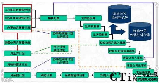 從上圖可以看出,河套酒業(yè)包括股份公司、生產公司、銷售公司、辦事處等獨立核算的實體或分子公司,但是實際上整個供應鏈系統(tǒng)是完全集成在一起的。孤立的解決上述問題,只能帶來重復工作量、公司間相同業(yè)務不一致以及滯后、市場反應不及時等問題。因此跨公司實體,實現(xiàn)銷售計劃、生產計劃、采購計劃三大計劃集成、物流集成是白酒類生產企業(yè)供應鏈系統(tǒng)信息化的關鍵。