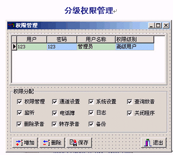 。。通話錄音或留言進(jìn)行查詢管理,可按日期、時(shí)間、電話號(hào)碼、線路、通話長(zhǎng)度、人員等條件對(duì)錄音進(jìn)行快速檢索、播放,也可將錄音文件進(jìn)行刪除、標(biāo)記、轉(zhuǎn)存、備份等操作。分級(jí)權(quán)限管理